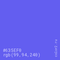 Цвет #635EF0 в цветовой модели RGB обозначается тремя октетами (99, 94, 240) в десятичном формате и #635EF0 в шестнадцатиричном (hex) формате, которые являются интенсивностью красного 99 (hex 63), интенсивность зелёного 94 (hex 5E) и интенсивность синего 240 (hex F0).
