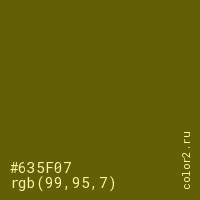 Цвет #635F07 в цветовой модели RGB обозначается тремя октетами (99, 95, 7) в десятичном формате и #635F07 в шестнадцатиричном (hex) формате, которые являются интенсивностью красного 99 (hex 63), интенсивность зелёного 95 (hex 5F) и интенсивность синего 7 (hex 07).