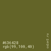 Цвет #636428 в цветовой модели RGB обозначается тремя октетами (99, 100, 40) в десятичном формате и #636428 в шестнадцатиричном (hex) формате, которые являются интенсивностью красного 99 (hex 63), интенсивность зелёного 100 (hex 64) и интенсивность синего 40 (hex 28).