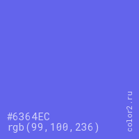 Цвет #6364EC в цветовой модели RGB обозначается тремя октетами (99, 100, 236) в десятичном формате и #6364EC в шестнадцатиричном (hex) формате, которые являются интенсивностью красного 99 (hex 63), интенсивность зелёного 100 (hex 64) и интенсивность синего 236 (hex EC).
