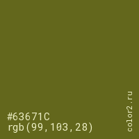 Цвет #63671C в цветовой модели RGB обозначается тремя октетами (99, 103, 28) в десятичном формате и #63671C в шестнадцатиричном (hex) формате, которые являются интенсивностью красного 99 (hex 63), интенсивность зелёного 103 (hex 67) и интенсивность синего 28 (hex 1C).