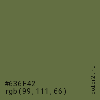 Цвет #636F42 в цветовой модели RGB обозначается тремя октетами (99, 111, 66) в десятичном формате и #636F42 в шестнадцатиричном (hex) формате, которые являются интенсивностью красного 99 (hex 63), интенсивность зелёного 111 (hex 6F) и интенсивность синего 66 (hex 42).