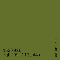 Цвет #63702C в цветовой модели RGB обозначается тремя октетами (99, 112, 44) в десятичном формате и #63702C в шестнадцатиричном (hex) формате, которые являются интенсивностью красного 99 (hex 63), интенсивность зелёного 112 (hex 70) и интенсивность синего 44 (hex 2C).