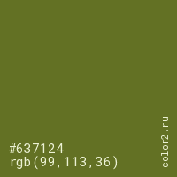 Цвет #637124 в цветовой модели RGB обозначается тремя октетами (99, 113, 36) в десятичном формате и #637124 в шестнадцатиричном (hex) формате, которые являются интенсивностью красного 99 (hex 63), интенсивность зелёного 113 (hex 71) и интенсивность синего 36 (hex 24).