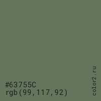Цвет #63755C в цветовой модели RGB обозначается тремя октетами (99, 117, 92) в десятичном формате и #63755C в шестнадцатиричном (hex) формате, которые являются интенсивностью красного 99 (hex 63), интенсивность зелёного 117 (hex 75) и интенсивность синего 92 (hex 5C).