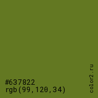 Цвет #637822 в цветовой модели RGB обозначается тремя октетами (99, 120, 34) в десятичном формате и #637822 в шестнадцатиричном (hex) формате, которые являются интенсивностью красного 99 (hex 63), интенсивность зелёного 120 (hex 78) и интенсивность синего 34 (hex 22).