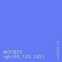 Цвет #637BF2 в цветовой модели RGB обозначается тремя октетами (99, 123, 242) в десятичном формате и #637BF2 в шестнадцатиричном (hex) формате, которые являются интенсивностью красного 99 (hex 63), интенсивность зелёного 123 (hex 7B) и интенсивность синего 242 (hex F2).