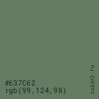 Цвет #637C62 в цветовой модели RGB обозначается тремя октетами (99, 124, 98) в десятичном формате и #637C62 в шестнадцатиричном (hex) формате, которые являются интенсивностью красного 99 (hex 63), интенсивность зелёного 124 (hex 7C) и интенсивность синего 98 (hex 62).
