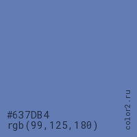 Цвет #637DB4 в цветовой модели RGB обозначается тремя октетами (99, 125, 180) в десятичном формате и #637DB4 в шестнадцатиричном (hex) формате, которые являются интенсивностью красного 99 (hex 63), интенсивность зелёного 125 (hex 7D) и интенсивность синего 180 (hex B4).