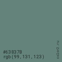 Цвет #63837B в цветовой модели RGB обозначается тремя октетами (99, 131, 123) в десятичном формате и #63837B в шестнадцатиричном (hex) формате, которые являются интенсивностью красного 99 (hex 63), интенсивность зелёного 131 (hex 83) и интенсивность синего 123 (hex 7B).