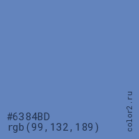 Цвет #6384BD в цветовой модели RGB обозначается тремя октетами (99, 132, 189) в десятичном формате и #6384BD в шестнадцатиричном (hex) формате, которые являются интенсивностью красного 99 (hex 63), интенсивность зелёного 132 (hex 84) и интенсивность синего 189 (hex BD).