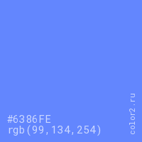 Цвет #6386FE в цветовой модели RGB обозначается тремя октетами (99, 134, 254) в десятичном формате и #6386FE в шестнадцатиричном (hex) формате, которые являются интенсивностью красного 99 (hex 63), интенсивность зелёного 134 (hex 86) и интенсивность синего 254 (hex FE).