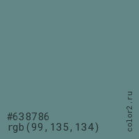 Цвет #638786 в цветовой модели RGB обозначается тремя октетами (99, 135, 134) в десятичном формате и #638786 в шестнадцатиричном (hex) формате, которые являются интенсивностью красного 99 (hex 63), интенсивность зелёного 135 (hex 87) и интенсивность синего 134 (hex 86).