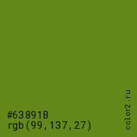 Цвет #63891B в цветовой модели RGB обозначается тремя октетами (99, 137, 27) в десятичном формате и #63891B в шестнадцатиричном (hex) формате, которые являются интенсивностью красного 99 (hex 63), интенсивность зелёного 137 (hex 89) и интенсивность синего 27 (hex 1B).