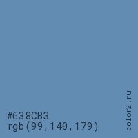 Цвет #638CB3 в цветовой модели RGB обозначается тремя октетами (99, 140, 179) в десятичном формате и #638CB3 в шестнадцатиричном (hex) формате, которые являются интенсивностью красного 99 (hex 63), интенсивность зелёного 140 (hex 8C) и интенсивность синего 179 (hex B3).