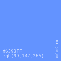 Цвет #6393FF в цветовой модели RGB обозначается тремя октетами (99, 147, 255) в десятичном формате и #6393FF в шестнадцатиричном (hex) формате, которые являются интенсивностью красного 99 (hex 63), интенсивность зелёного 147 (hex 93) и интенсивность синего 255 (hex FF).