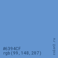 Цвет #6394CF в цветовой модели RGB обозначается тремя октетами (99, 148, 207) в десятичном формате и #6394CF в шестнадцатиричном (hex) формате, которые являются интенсивностью красного 99 (hex 63), интенсивность зелёного 148 (hex 94) и интенсивность синего 207 (hex CF).