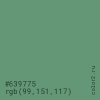 Цвет #639775 в цветовой модели RGB обозначается тремя октетами (99, 151, 117) в десятичном формате и #639775 в шестнадцатиричном (hex) формате, которые являются интенсивностью красного 99 (hex 63), интенсивность зелёного 151 (hex 97) и интенсивность синего 117 (hex 75).