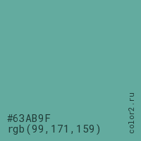 Цвет #63AB9F в цветовой модели RGB обозначается тремя октетами (99, 171, 159) в десятичном формате и #63AB9F в шестнадцатиричном (hex) формате, которые являются интенсивностью красного 99 (hex 63), интенсивность зелёного 171 (hex AB) и интенсивность синего 159 (hex 9F).