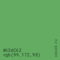 Цвет #63AC62 в цветовой модели RGB обозначается тремя октетами (99, 172, 98) в десятичном формате и #63AC62 в шестнадцатиричном (hex) формате, которые являются интенсивностью красного 99 (hex 63), интенсивность зелёного 172 (hex AC) и интенсивность синего 98 (hex 62).
