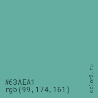Цвет #63AEA1 в цветовой модели RGB обозначается тремя октетами (99, 174, 161) в десятичном формате и #63AEA1 в шестнадцатиричном (hex) формате, которые являются интенсивностью красного 99 (hex 63), интенсивность зелёного 174 (hex AE) и интенсивность синего 161 (hex A1).