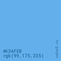 Цвет #63AFEB в цветовой модели RGB обозначается тремя октетами (99, 175, 235) в десятичном формате и #63AFEB в шестнадцатиричном (hex) формате, которые являются интенсивностью красного 99 (hex 63), интенсивность зелёного 175 (hex AF) и интенсивность синего 235 (hex EB).
