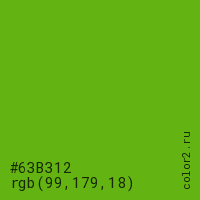 Цвет #63B312 в цветовой модели RGB обозначается тремя октетами (99, 179, 18) в десятичном формате и #63B312 в шестнадцатиричном (hex) формате, которые являются интенсивностью красного 99 (hex 63), интенсивность зелёного 179 (hex B3) и интенсивность синего 18 (hex 12).