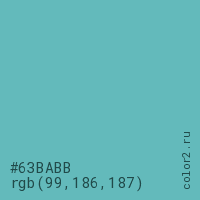 Цвет #63BABB в цветовой модели RGB обозначается тремя октетами (99, 186, 187) в десятичном формате и #63BABB в шестнадцатиричном (hex) формате, которые являются интенсивностью красного 99 (hex 63), интенсивность зелёного 186 (hex BA) и интенсивность синего 187 (hex BB).