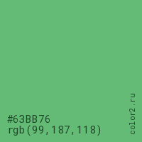 Цвет #63BB76 в цветовой модели RGB обозначается тремя октетами (99, 187, 118) в десятичном формате и #63BB76 в шестнадцатиричном (hex) формате, которые являются интенсивностью красного 99 (hex 63), интенсивность зелёного 187 (hex BB) и интенсивность синего 118 (hex 76).