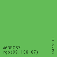 Цвет #63BC57 в цветовой модели RGB обозначается тремя октетами (99, 188, 87) в десятичном формате и #63BC57 в шестнадцатиричном (hex) формате, которые являются интенсивностью красного 99 (hex 63), интенсивность зелёного 188 (hex BC) и интенсивность синего 87 (hex 57).