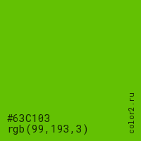 Цвет #63C103 в цветовой модели RGB обозначается тремя октетами (99, 193, 3) в десятичном формате и #63C103 в шестнадцатиричном (hex) формате, которые являются интенсивностью красного 99 (hex 63), интенсивность зелёного 193 (hex C1) и интенсивность синего 3 (hex 03).