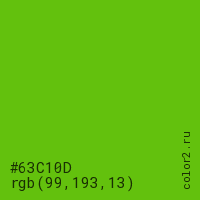 Цвет #63C10D в цветовой модели RGB обозначается тремя октетами (99, 193, 13) в десятичном формате и #63C10D в шестнадцатиричном (hex) формате, которые являются интенсивностью красного 99 (hex 63), интенсивность зелёного 193 (hex C1) и интенсивность синего 13 (hex 0D).