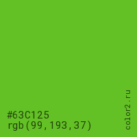 Цвет #63C125 в цветовой модели RGB обозначается тремя октетами (99, 193, 37) в десятичном формате и #63C125 в шестнадцатиричном (hex) формате, которые являются интенсивностью красного 99 (hex 63), интенсивность зелёного 193 (hex C1) и интенсивность синего 37 (hex 25).