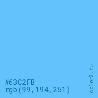Цвет #63C2FB в цветовой модели RGB обозначается тремя октетами (99, 194, 251) в десятичном формате и #63C2FB в шестнадцатиричном (hex) формате, которые являются интенсивностью красного 99 (hex 63), интенсивность зелёного 194 (hex C2) и интенсивность синего 251 (hex FB).
