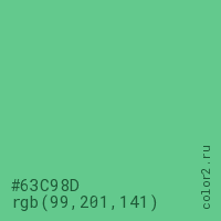 Цвет #63C98D в цветовой модели RGB обозначается тремя октетами (99, 201, 141) в десятичном формате и #63C98D в шестнадцатиричном (hex) формате, которые являются интенсивностью красного 99 (hex 63), интенсивность зелёного 201 (hex C9) и интенсивность синего 141 (hex 8D).