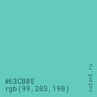Цвет #63CBBE в цветовой модели RGB обозначается тремя октетами (99, 203, 190) в десятичном формате и #63CBBE в шестнадцатиричном (hex) формате, которые являются интенсивностью красного 99 (hex 63), интенсивность зелёного 203 (hex CB) и интенсивность синего 190 (hex BE).