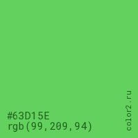 Цвет #63D15E в цветовой модели RGB обозначается тремя октетами (99, 209, 94) в десятичном формате и #63D15E в шестнадцатиричном (hex) формате, которые являются интенсивностью красного 99 (hex 63), интенсивность зелёного 209 (hex D1) и интенсивность синего 94 (hex 5E).