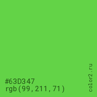 Цвет #63D347 в цветовой модели RGB обозначается тремя октетами (99, 211, 71) в десятичном формате и #63D347 в шестнадцатиричном (hex) формате, которые являются интенсивностью красного 99 (hex 63), интенсивность зелёного 211 (hex D3) и интенсивность синего 71 (hex 47).