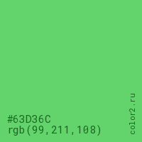 Цвет #63D36C в цветовой модели RGB обозначается тремя октетами (99, 211, 108) в десятичном формате и #63D36C в шестнадцатиричном (hex) формате, которые являются интенсивностью красного 99 (hex 63), интенсивность зелёного 211 (hex D3) и интенсивность синего 108 (hex 6C).
