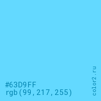 Цвет #63D9FF в цветовой модели RGB обозначается тремя октетами (99, 217, 255) в десятичном формате и #63D9FF в шестнадцатиричном (hex) формате, которые являются интенсивностью красного 99 (hex 63), интенсивность зелёного 217 (hex D9) и интенсивность синего 255 (hex FF).