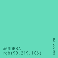 Цвет #63DBBA в цветовой модели RGB обозначается тремя октетами (99, 219, 186) в десятичном формате и #63DBBA в шестнадцатиричном (hex) формате, которые являются интенсивностью красного 99 (hex 63), интенсивность зелёного 219 (hex DB) и интенсивность синего 186 (hex BA).