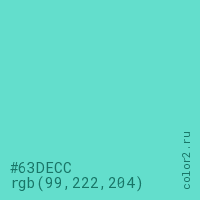 Цвет #63DECC в цветовой модели RGB обозначается тремя октетами (99, 222, 204) в десятичном формате и #63DECC в шестнадцатиричном (hex) формате, которые являются интенсивностью красного 99 (hex 63), интенсивность зелёного 222 (hex DE) и интенсивность синего 204 (hex CC).
