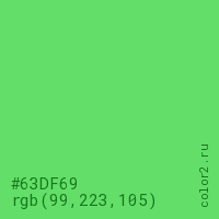 Цвет #63DF69 в цветовой модели RGB обозначается тремя октетами (99, 223, 105) в десятичном формате и #63DF69 в шестнадцатиричном (hex) формате, которые являются интенсивностью красного 99 (hex 63), интенсивность зелёного 223 (hex DF) и интенсивность синего 105 (hex 69).