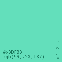 Цвет #63DFBB в цветовой модели RGB обозначается тремя октетами (99, 223, 187) в десятичном формате и #63DFBB в шестнадцатиричном (hex) формате, которые являются интенсивностью красного 99 (hex 63), интенсивность зелёного 223 (hex DF) и интенсивность синего 187 (hex BB).