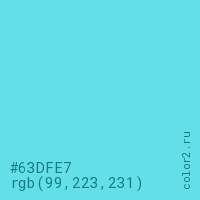Цвет #63DFE7 в цветовой модели RGB обозначается тремя октетами (99, 223, 231) в десятичном формате и #63DFE7 в шестнадцатиричном (hex) формате, которые являются интенсивностью красного 99 (hex 63), интенсивность зелёного 223 (hex DF) и интенсивность синего 231 (hex E7).