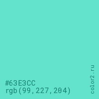 Цвет #63E3CC в цветовой модели RGB обозначается тремя октетами (99, 227, 204) в десятичном формате и #63E3CC в шестнадцатиричном (hex) формате, которые являются интенсивностью красного 99 (hex 63), интенсивность зелёного 227 (hex E3) и интенсивность синего 204 (hex CC).