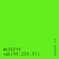 Цвет #63EF1F в цветовой модели RGB обозначается тремя октетами (99, 239, 31) в десятичном формате и #63EF1F в шестнадцатиричном (hex) формате, которые являются интенсивностью красного 99 (hex 63), интенсивность зелёного 239 (hex EF) и интенсивность синего 31 (hex 1F).