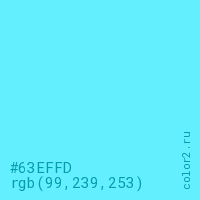 Цвет #63EFFD в цветовой модели RGB обозначается тремя октетами (99, 239, 253) в десятичном формате и #63EFFD в шестнадцатиричном (hex) формате, которые являются интенсивностью красного 99 (hex 63), интенсивность зелёного 239 (hex EF) и интенсивность синего 253 (hex FD).