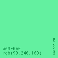 Цвет #63F0A0 в цветовой модели RGB обозначается тремя октетами (99, 240, 160) в десятичном формате и #63F0A0 в шестнадцатиричном (hex) формате, которые являются интенсивностью красного 99 (hex 63), интенсивность зелёного 240 (hex F0) и интенсивность синего 160 (hex A0).