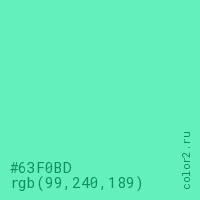 Цвет #63F0BD в цветовой модели RGB обозначается тремя октетами (99, 240, 189) в десятичном формате и #63F0BD в шестнадцатиричном (hex) формате, которые являются интенсивностью красного 99 (hex 63), интенсивность зелёного 240 (hex F0) и интенсивность синего 189 (hex BD).
